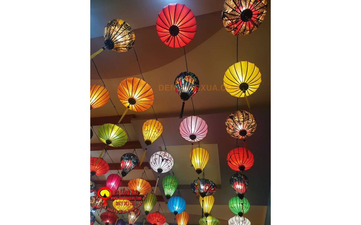 - Bố cục sáng tạo: Không chỉ treo đơn lẻ, có thể kết hợp đèn lồng thành các cụm, chuỗi, hoặc tạo hình nghệ thuật (ví dụ: hình mái nhà cổ, con thuyền, bông hoa...) để tăng tính ấn tượng.